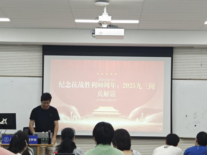 随后,团支部书记龙柄屹同学主持《纪念抗战胜利80周年:2025九三阅兵解读》主题团日活动。活动通过战旗方队的震撼画面,生动展现人民军队对红色血脉的赓续传承;结合阅兵细节,清晰宣示中国始终坚持和平发展道路的立场,强调强大军力的根本目的是捍卫和平,武器是守护安宁的盾牌而非扩张利剑,体现中国以军力维护和平、践行负责任大国担当的立场。