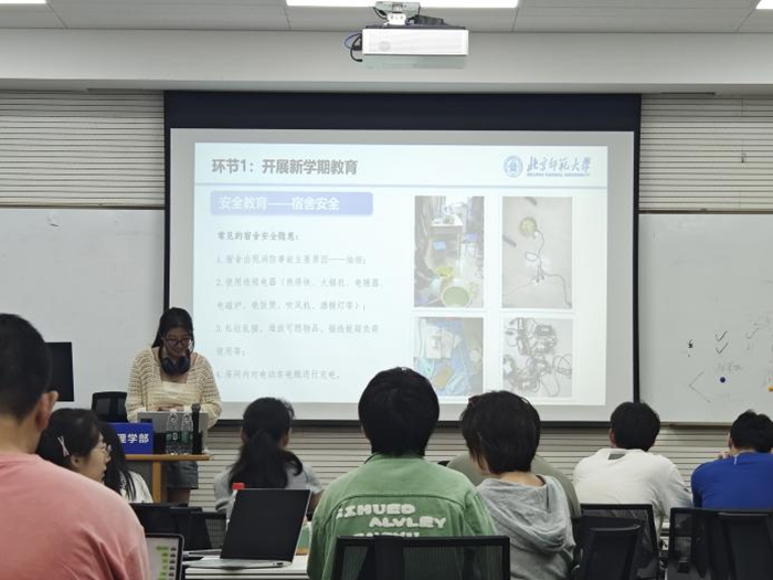 紧接着,班主任李海虹老师与班长董霖同学开展了开学教育,内容聚焦新学期教育与学生发展支持相关工作两大板块。在新学期教育方面,围绕宿舍安全、消防安全、网络安全、交通安全等维度重申安全红线,倡导杜绝餐饮浪费,鼓励大家积极参与《你光盘・我有礼》打卡活动,将节约理念融入日常;在学生发展支持相关工作环节,系统梳理了多元支持渠道:职业发展与就业指导中心可提供职业咨询、职业测评等定制化服务;勤工助学制度能为有需要的同学提供经济补助,创造实践锻炼机会;心理健康层面,雪绒花心理平台、学堂在线、个体心理咨询等资源助力同学们及时获取支持;此外,京师学工也将全程跟进,为同学们的学业稳步推进保驾护航。