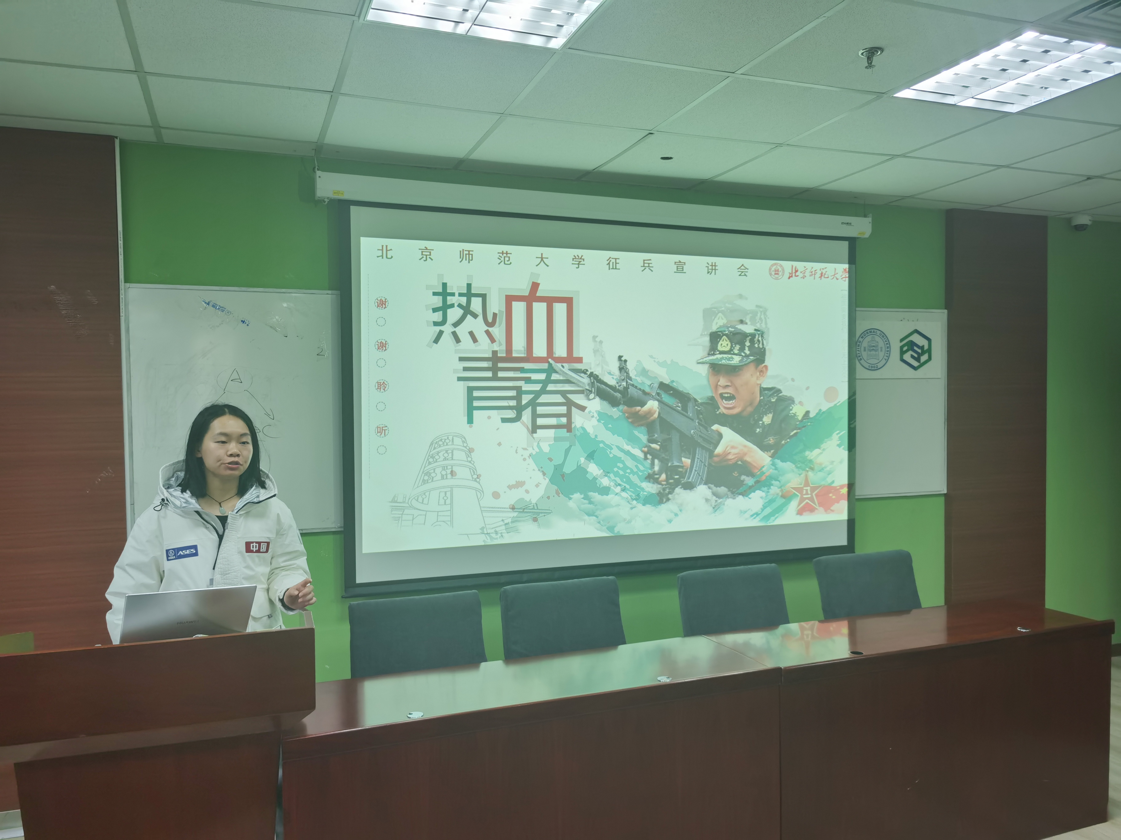 接着,教育学部的韦湧波同学向大家分享征兵政策。他以习近平总书记给南开大学新入伍大学生的回信和习总书记的寄语作为切入点,鼓励同学们积极参军入伍。韦湧波同学介绍了征兵的时间、应征条件和应征指南,以及经济优待、复学保研和就业留京政策等应征入伍的各项政策优待等,让同学们对征兵报名有了更为具体、细致的了解。同时,韦湧波同学还向大家分享了留队对于个人未来成长和发展的好处,鼓励大家积极响应国家号召,携笔从戎、投身军营。