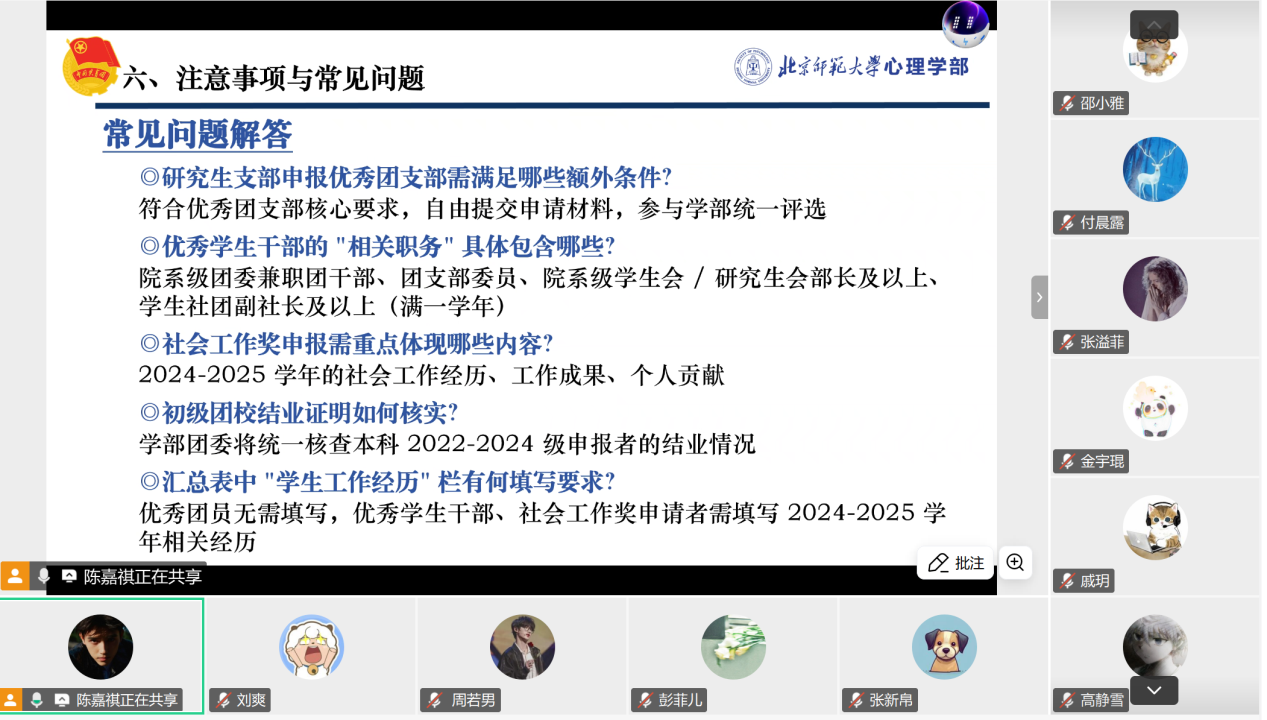 2025年11月28日晚20时,金牌影院 团委于线上召开了2025-2026学年第二次团支书大会。会议由团委组织部部长陈嘉祺主持。本次会议的主题聚焦于2024-2025学年共青团优秀集体及个人的评选工作。由于议题安排,未对2025级新生团支书作参会要求。在应参会的非新生团支书(共21人)中,实际参会14人,实到人数超过应到人数半数。会议就相关工作进行了传达与部署。 大会强调,2024-2025学年共青团优秀集体及个人的评选工作旨在通过公正的评选机制,表彰过去一年中表现突出的团支部与个人,进一步激发团学组织的活力。