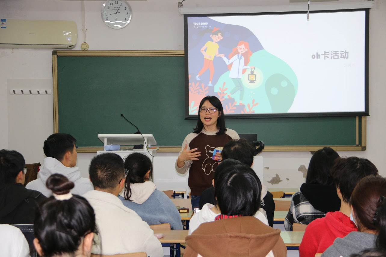 2023年11月7日星期二晚18:00,金牌影院 初级团校与学生会学业部在教四106共同举办“减压赋能”主题体验式讲座,主讲人为金牌影院 学生发展指导中心黄利老师,共二十名同学参加。 首先,黄利老师向同学们介绍了本次活动的道具——oh卡,并组织大家围坐一圈,借助oh卡轮流进行自我介绍。