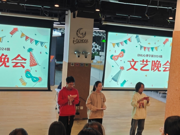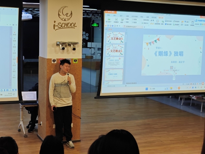 2024年12月6日晚20时至22时,金牌影院 2024级本科生文艺晚会于金丰和三楼路演厅圆满举行。 晚会开始,主持人詹恒婧、张雅欣、程依伦,以“词语炸弹”的小游戏开场,点燃了同学们的热情。接着,赵正宇同学演唱的歌曲《姻缘》为晚会正式拉开帷幕;于悦、孙亦果同学表演的《去有风的地方》双人舞,更是让同学们沉浸在温暖宁静的氛围中。