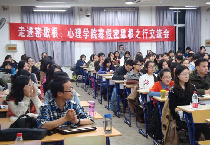 2013年3月13日晚八点,金牌影院 心理学院“走进密歇根:心理学院寒假密歇根之行交流会”在教二201教室举办。2013年1月19日至2月1日,心理学院副院长周仁来老师、分党委书记乔志宏老师及17名本科生组成的代表团前往密歇根大学进行学术交流。在为期两周的时间里,双方教授开展了卓有成效的会谈。参与交流的17名本科生,旁听了密歇根大学心理学系的本科生课程和心理学及其他学科的学术报告会,参与了许多富有特色的学生活动。通过与当地同学的交流全面地了解美国大学的教学、生活情况及中美文化的差异。 心理学院学生会从学生们实际需求出发,邀请代表团的老师、同学为更多学生分享大洋两端的学术进展与不同的校园氛围。此次交流会得到了学校、学院领导的大力支持。心理学院副院长周仁来教授,作为密歇根之行的带队老师之一,对整个活动的策划、进展给予密切关注。心理学院院长许燕教授,国际交流与合作处副处长刘冷馨老师,以及从美国回来的校友韩英全程参与了此次的交流会,与同学们进行了面对面的交流。 许燕院长首先明确了“密歇根之行”对于心理学院具有里程碑意义,向同学们介绍了学院未来对于国际交流方面工作的设想,以及对同学们未来发展的希望与期盼。希望同学们走出去培养自身的国际化视野,然后再回到我们学校、学院为我们的发展做出自己的努力。国际交流与合作处的刘冷馨老师介绍了从自己的角度出发未来国际交流处能为同学们出国交流提供哪些更好的项目,表达了学校对于学生国际交流活动的重视与支持,也热情欢迎学生找她交流沟通。周仁来教授作为最后发言的老师,一方面为大家说明了此次交流会的意义;另一方面也跟同学们分享了“密歇根之行”的总体感受与情况。周仁来教授风趣幽默的表述,让同学们对接下来进行的学生交流环节充满了期待。 前往密歇根交流的三位学生代表朱浩然、黄煜舒、万嘉昕分别从交流活动的行程、从中美课堂不同看中美教育对比以及从自身感受出发谈美国校园文化与社会文化三个方面与同学们进行了分享。嘉宾韩英老师讲述了她20多年的海外经历及自己对于国外生活的体会,对“密歇根之行”同学们的所思所感表示了赞同,也提出了自己长时间在国外生活看到的更多的东西。 提问环节中,在了解同学们的困惑的同时,对于学生们提出的问题许燕院长悉心解答,并提出了自己的希望,希望同学们能够找到学习的内在动机,找到对学习的热情、对生活的热情。同学们都表示,这样与老师面对面的交流、诚挚地沟通的机会特别可贵,在此过程中增强了与老师的情感交流,也同时增进了师生之间的相互理解。至此,密歇根之行交流会圆满结束了,但心理学院为给同学们提供更好的国际交流项目所做的努力还在继续!