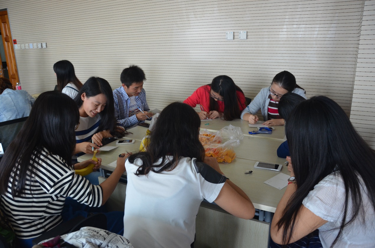 第三部分的主题是“趣味小组比赛”。每个小组在不知道比赛内容的前提下随机派出一名代表参加比赛。比赛的内容设置多样。例如,比较参赛者上衣颜色的深浅,猜测某位同学的鞋子的颜色等等,输的参赛者所在的小组一起表演一个节目,例如:“站报纸”,“哑剧表演”等。通过这个环节,增进了小组成员彼此的了解,促进了成员之间的沟通、协作。大家乐在其中。 图四 北师大心理学院MAP-1班第一次班级活动欢乐瞬间