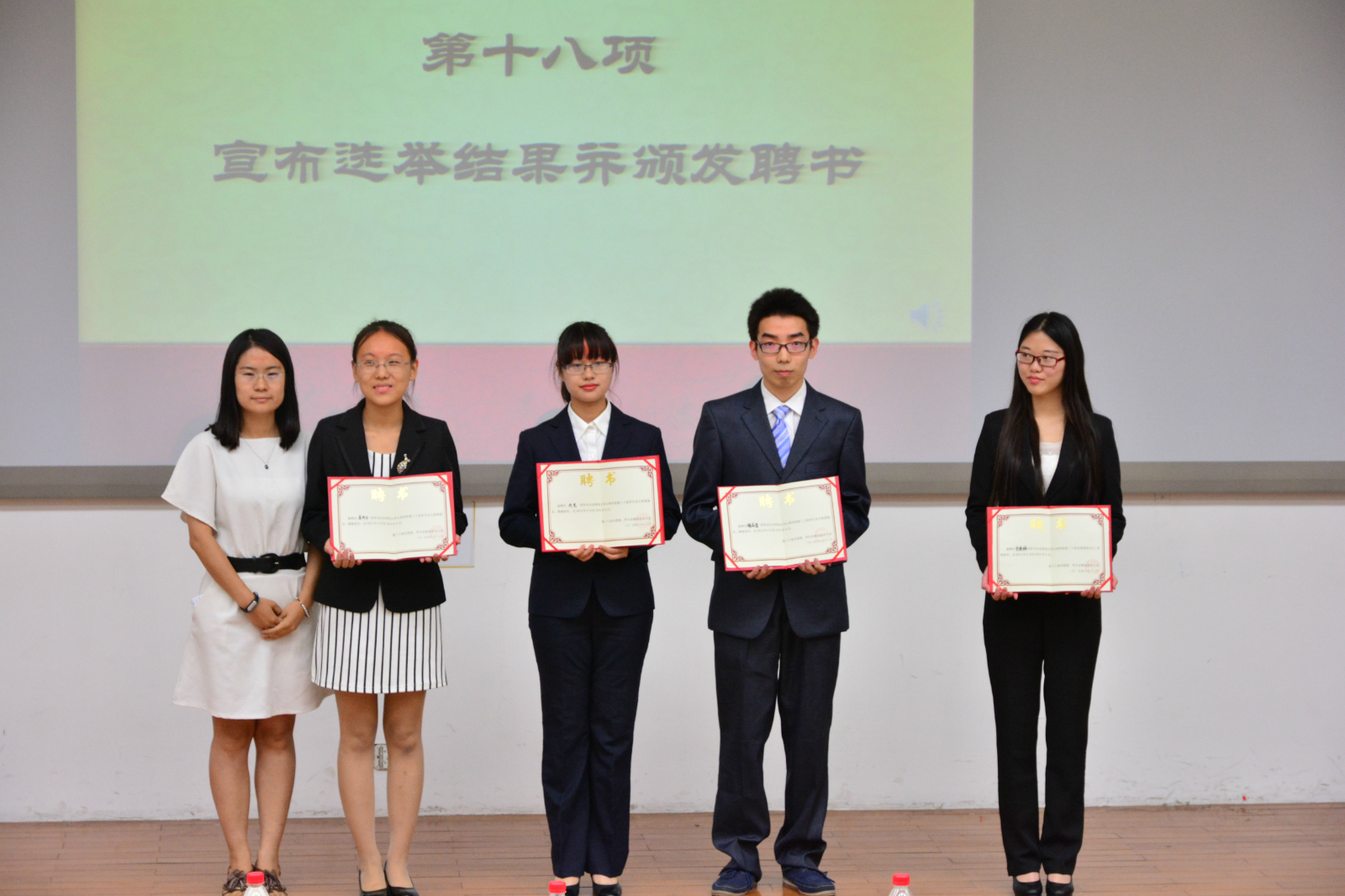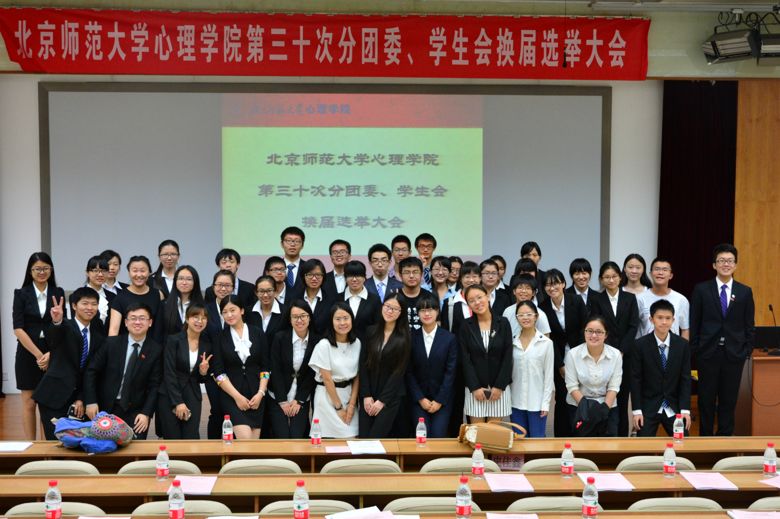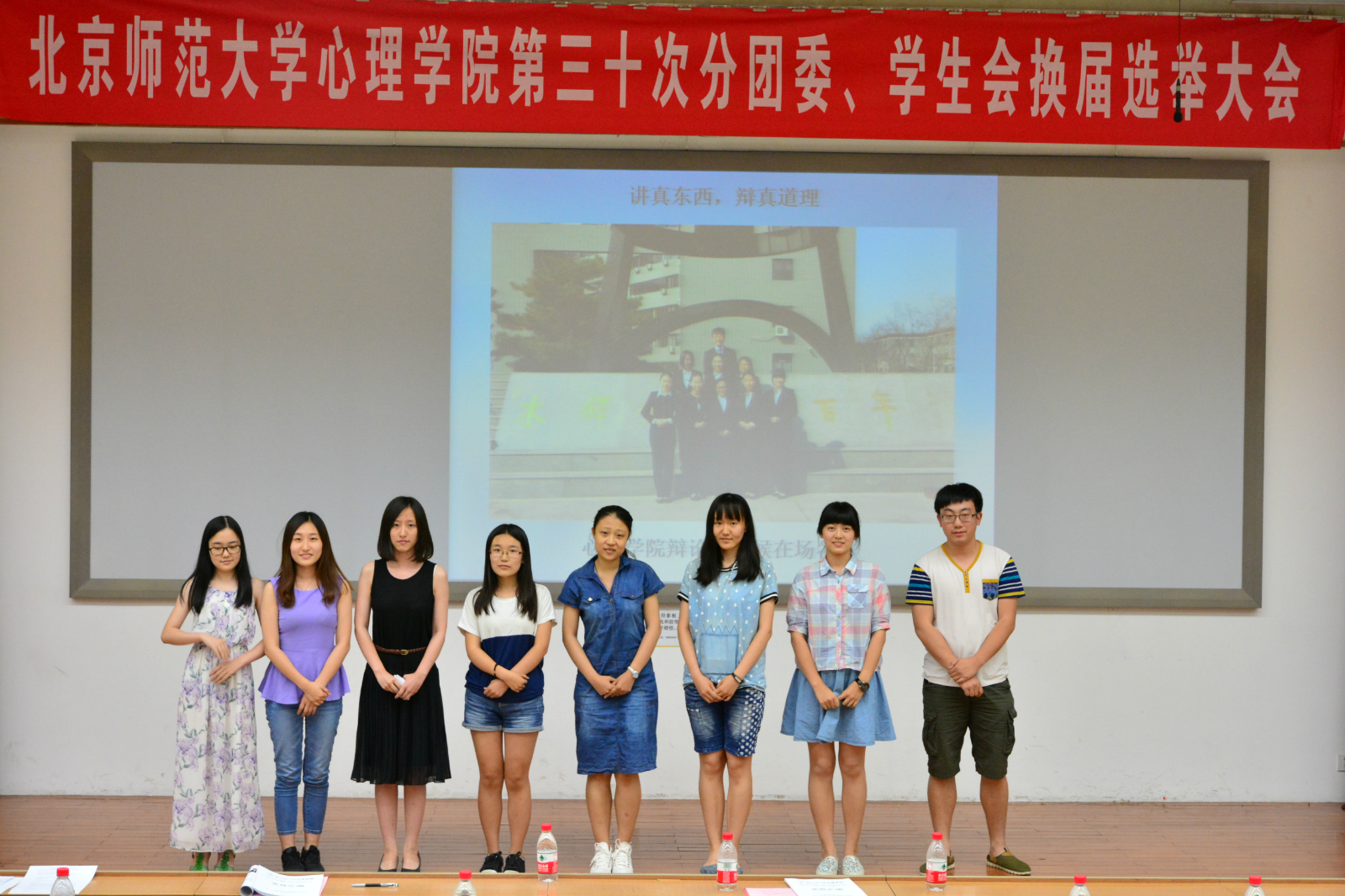 2015年6月13日,心理学院第三十次分团委、学生会换届选举大会在教九502隆重召开。校团委副书记于小雷老师,地理学与遥感科学学院分团委书记倪佳琪老师,信息科学与技术学院分团委书记奚琦老师,校学生会主席宋来同学以及各院系学生代表受邀出席大会,我院分党委书记乔志宏老师,副书记王瑞敏老师,分团委书记史佳鑫老师以及全院200余名同学也参加了此次大会。大会由心理学院学生会副主席邓孟迪同学主持。 晚七时,大会开幕,全场起立,高唱《中华人民共和国国歌》。首先,校团委副书记于小雷老师致辞。他在致辞中充分肯定了心理学院分团委、学生会一年以来的工作,并向大会的召开表示热烈的祝贺。随后,心理学院分党委书记乔志宏老师致辞。乔老师勉励同学们在发展专业的同时要积极拓宽自己的眼界,培养自己的人文素养,勇于承担社会赋予的责任,在服务同学、服务社会的过程中锻炼自己。另外,乔老师对学生会提出希望,希望心理学院学生会要以维护同学们的权益为使命,以用心理学的专业知识服务师生、服务社会为己任,继承传统、勇于创新,在学生工作中实现自己的价值。 接下来,宋来同学代表校学生会致辞,表达了对新一届团学工作领导班子的期许。 心理学院学生会副主席闫梦格同学代表筹委会向大会做了筹备情况报告。分团委副书记张文菊同学、学生会主席张笑然同学分别向大会报告了2014-2015学年分团委和学生会工作情况。 报告结束后,大会进入选举环节,分团委、学生会候选人依次进行竞选演讲并接受在场同学们的提问。随后,在总监票人张照鹏同学的主持下,在场全体同学进行了无记名投票。大会计票期间,李小红同学向大会做了学生提案报告。之后,心理学院优秀团体代表——辩论队以及棒垒球进行了团体风采展,与大家分享了这一年来的收获与感悟。 计票结束后,总监票人张照鹏同学宣读了计票结果,分团委书记史佳鑫老师宣布了选举结果,大会选举产生了金牌影院 心理学院第三十届分团委副书记甘琳琳,学生会主席团成员储成晋、代艺、李卉子。随后,史佳鑫老师对心理学院全体同学以及老一届学生干部表达了感谢,同时鼓励新一届的学生干部珍视大会赋予的权力,继续努力为学院同学服务。 最后,王瑞敏老师做了简短的发言,王老师在发言中充分肯定了第二十九届分团委、学生会在各项工作中取得的出色成绩,同时表达了对新一届学生领导班子的期许和要求。王老师指出,培养学生工作能力、锻炼管理能力提升综合素质对每个本科生都意义非凡,希望大家利用好心理学院的平台,积极进取,追求卓越。 在掌声中,本次换届选举大会圆满结束。新一轮的学生工作即将开始,我们相信,在新一届学生干部的努力下,心理学院的团学工作将会越来越好!