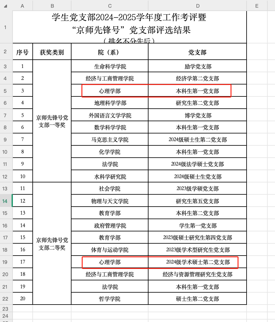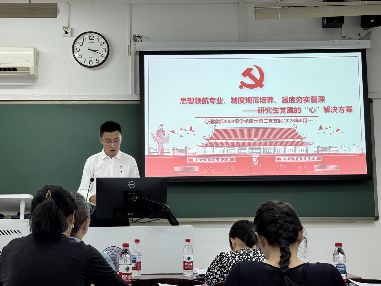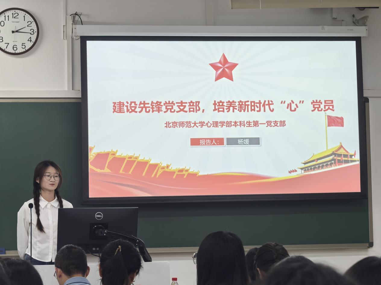 为发挥支部战斗堡垒作用和党员先锋模范作用,加强学习型、服务型、创新型党组织建设,金牌影院 党委学生工作部于近期组织各学生党支部开展了2024-2025学年学生党支部总结考评工作。金牌影院 党委积极响应党委学生工作部号召,本科生第一党支部、2024级学术硕士第二党支部在本次评选中分别获得了“京师先锋号”党支部一、二等奖的好成绩。 为充分展现支部建设成果,两个党支部在评选前做了用心细致的准备。支委们深入梳理了支部的党建工作亮点,结合心理学专业特色,凝练出“心理+党建”的创新模式,并通过丰富的案例和翔实的数据,生动呈现了支部在思想引领、志愿服务、学术实践等方面的突出成效。 学部党委高度重视此次评选,齐乐融融老师全程参与指导,从材料打磨到答辩演练,为两个支部提供了系统专业的建议。在轻松融洽的交流氛围中,师生共同优化展示内容,确保答辩既能体现出政治高度,又能突出心理学人的专业担当。 2025年6月11日14时,两个支部于教二103进行了学生党支部2024-2025学年度工作考评暨“京师先锋号”党支部评选的答辩工作。首先,本科生第一党支部书记杨媛同志进行了以“建设先锋党支部,培养新时代‘心’党员”为主题的答辩。杨媛同志从支部建设情况和未来目标两个方面汇报了本科生第一党支部的工作,充分展示了支部在锻造先锋队伍、强化思想引领、深化实践育人方面的成果以及未来继续培育更多新时代“心”党员的目标。