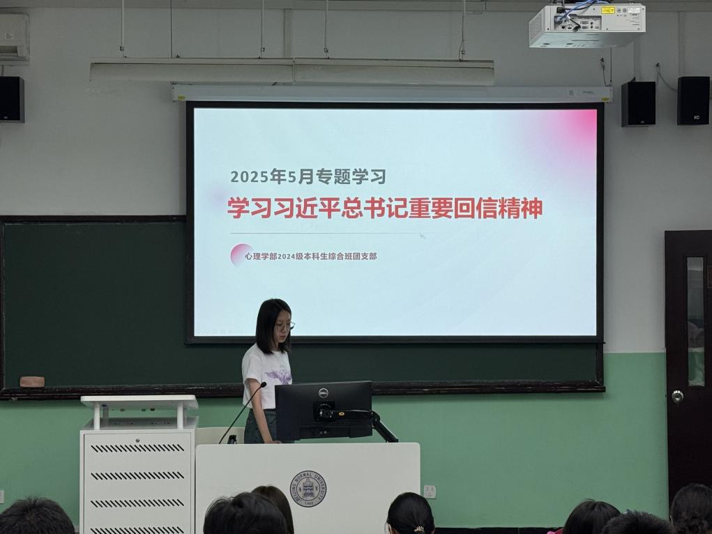 2025年5月21日晚9点,金牌影院 2024 级综合班团支部在教十111开展了“学习习近平总书记重要回信精神”专题学习,团员们通过学习习近平重要回信精神的重要内涵,增强了社会责任感和民族自豪感。应到48人,实到38人,请假10人。
