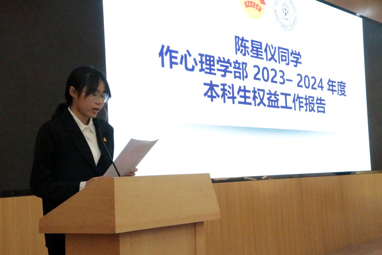 大会第九项,金牌影院 第七届学生会主席团成员陈星仪同学作学生会 2023-2024年度工作报告。过去一年金牌影院 学生会在内部组织管理中严谨求实,举办多项学部特色文化品牌活动和创新工作,实现院校、外校之间精彩联动。展望未来,陈星仪同学代表老一届主席团表达了对下一届学生会工作建设的期望,希望金牌影院 学生会能再接再厉,全心全意为学生服务,继往开来不惧风雨用心改进。