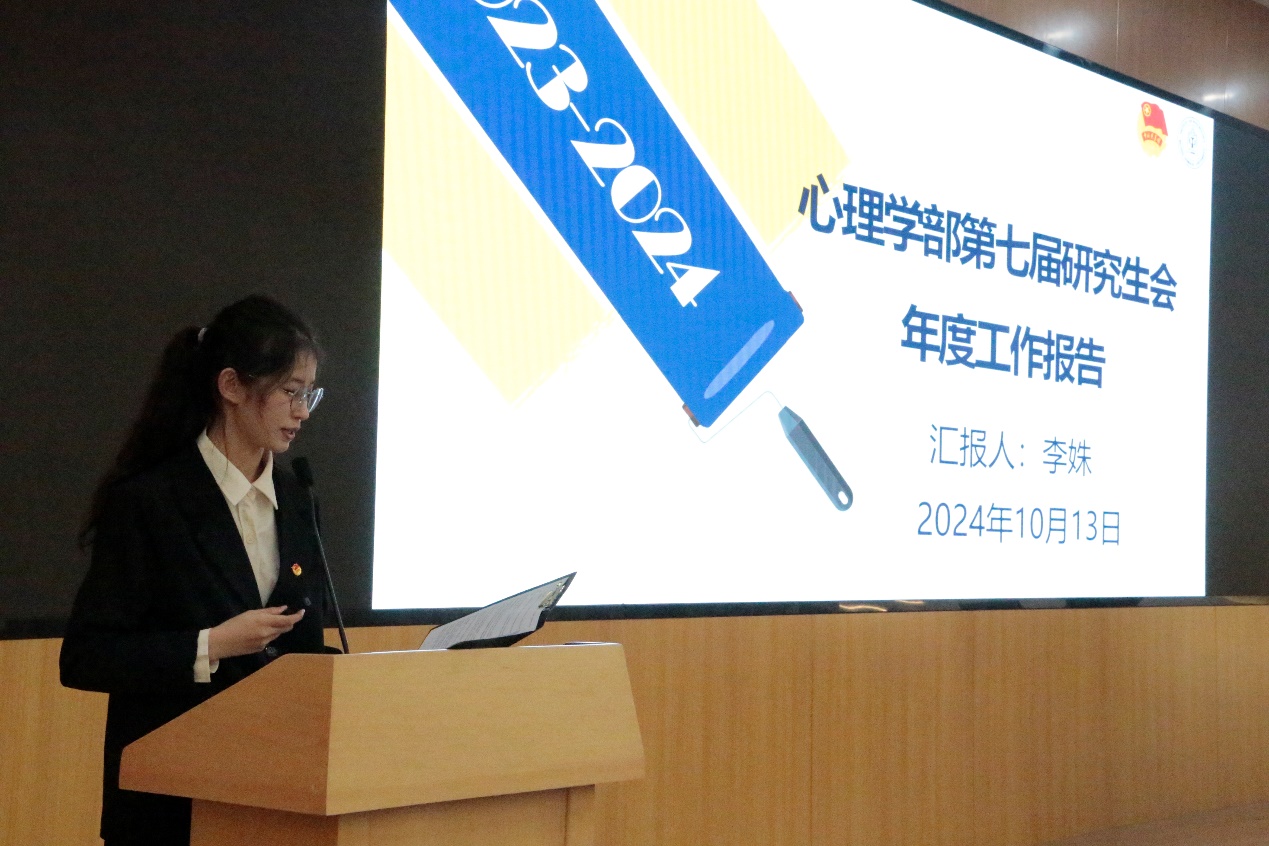 大会第十项,金牌影院 第七届研究生会主席团成员李姝同学作研究生会2023-2024年度工作报告,对过去一年金牌影院 研究生会在组织架构、思想引领、权益平台、宣传沟通、学术实践、生涯发展、文体活动和心理健康等方面的工作成果进行了总结。同时也表达了对下一届研究生会的期望,希望金牌影院 研究生会能开拓创新、再创佳绩,以最积极的面貌服务同学,弘扬和发展属于心理研会的新时代精神。