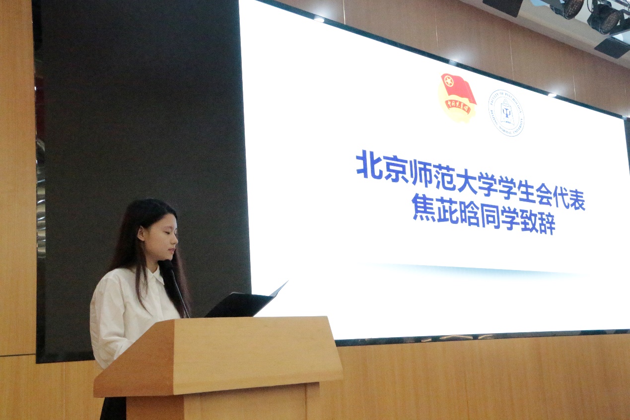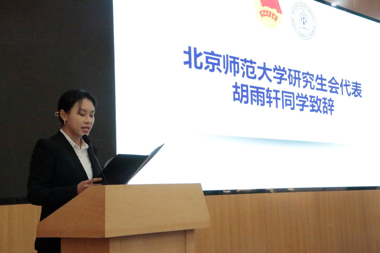 接下来,由校研究生会代表胡雨轩同学致辞,她总结了过去一年金牌影院 研究生会各种卓有成效的工作,赞扬了金牌影院 研究生会严谨工作、创新进步的工作氛围,希望金牌影院 研究生会能继续积极进取,为同学服务。