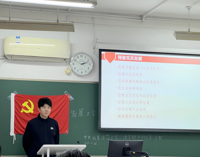 会议第一项,全体同志面向党旗站立,奏唱《国际歌》。第二项,程先楷同志介绍本次大会流程及拟发展发展对象。 第三项,发展对象赵桢碧、罗珏、简心蕊依次宣读入党志愿书,三位汇报了自己的入党动机、为人民服务的情况,表明了自己入党的志愿和决心。随后,入党介绍人宣读介绍意见,支委会宣读政治审查报告,在场的党员也展开民主讨论,对三名同志平时的表现进行了评价和肯定。