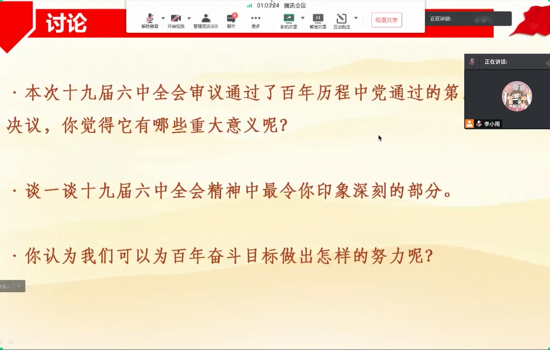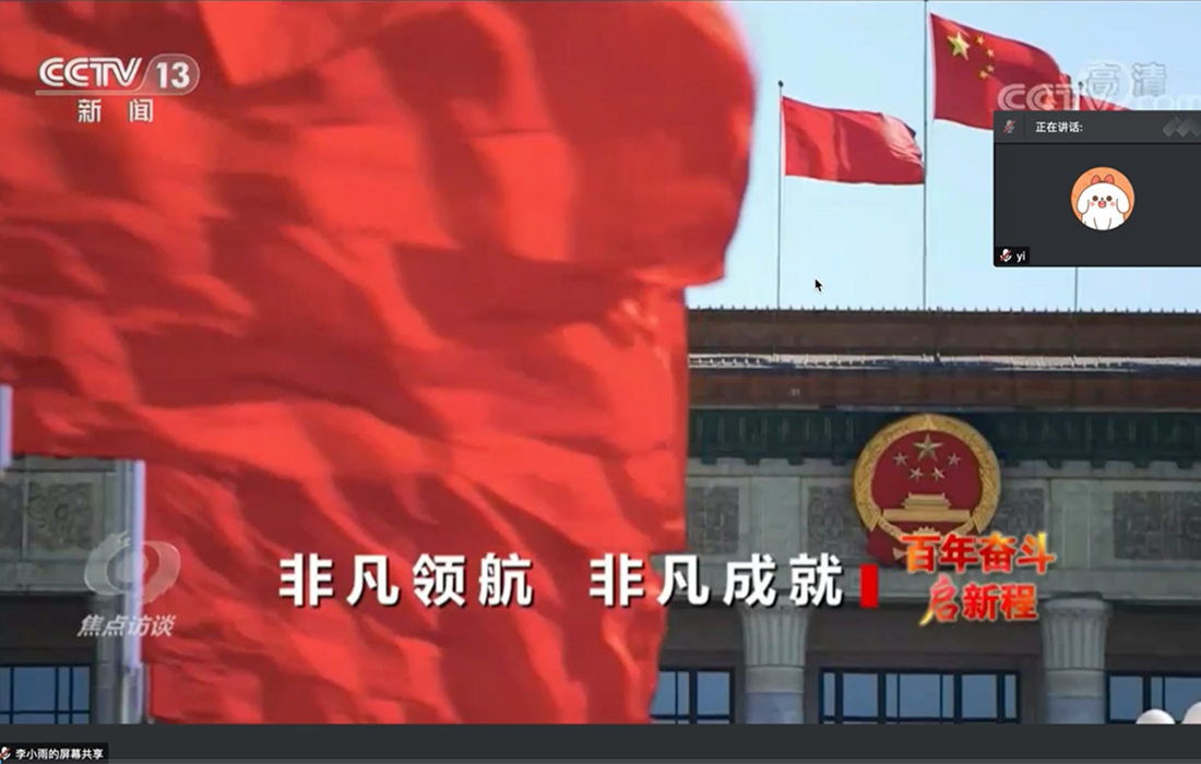 2021年11月19日晚6点,金牌影院 本科生党支部第一党小组通过“腾讯会议”在线上顺利召开了党小组会,会议由党小组组长李小雨同志主持,共64名成员参与。本次会议的主要内容是观看《焦点访谈:百年奋斗启新程 非凡领航 非凡成就》,并针对十九届六中全会审议的精神进行讨论交流。 会议一开始,李小雨同志首先带领所有人一起奏唱了国际歌。接下来正式开始观看《焦点访谈:百年奋斗启新程 非凡领航 非凡成就》。