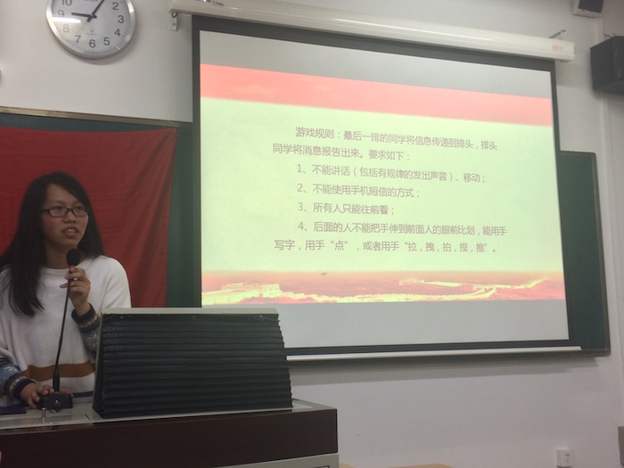2016年11月14日晚上八点,心理学院2015级1班班会在教二214成功召开,本次班会的主题是我与社会主义核心价值观。 班会采用抽签的形式开始,每个签都包含一个核心价值观的词,同学找到与自己所抽到词相对应地方就坐;当每个同学都入座以后,班会正式开始,团支书孙洪力首先为同学们播放了一个背景视频,使大家了解了社会主义核心价值观的内容。视频结束后,团支书为大家解释了社会主义核心价值观每个词语的意义。随后,团支书组织大家分组讨论,将每组抽到的词与双十一结合起来,短暂且热烈的讨论过后,每一组都派出了一个代表来总结自己小组的讨论内容,对于爱国,有同学喊出了“双十一我不是单身狗,我与祖国在一起”。通过讨论,每个同学都对社会主义核心价值观有了深刻的理解。之后,由雪绒花使者组织大家进行一个消息传递的游戏,同学们的热情高涨,现场气氛热烈。 最后,由卢家琪简短的总结了此次活动的内容,本次班会顺利结束。