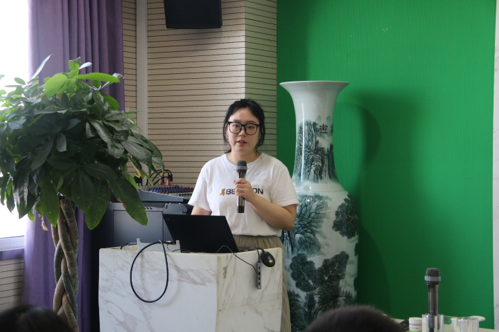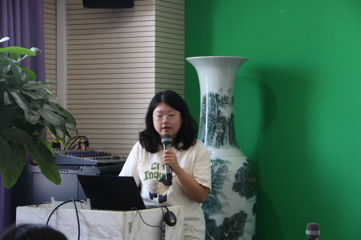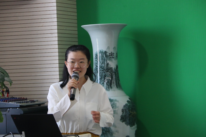 图7 学生工作办公室孙杨柳老师介绍研究生事务 学生工作办公室梁静老师向同学们介绍了金牌影院 研究生会的组织构架与特色活动,分享了金牌影院 的“心动π合唱团”,鼓励大家多参与到学生活动中。