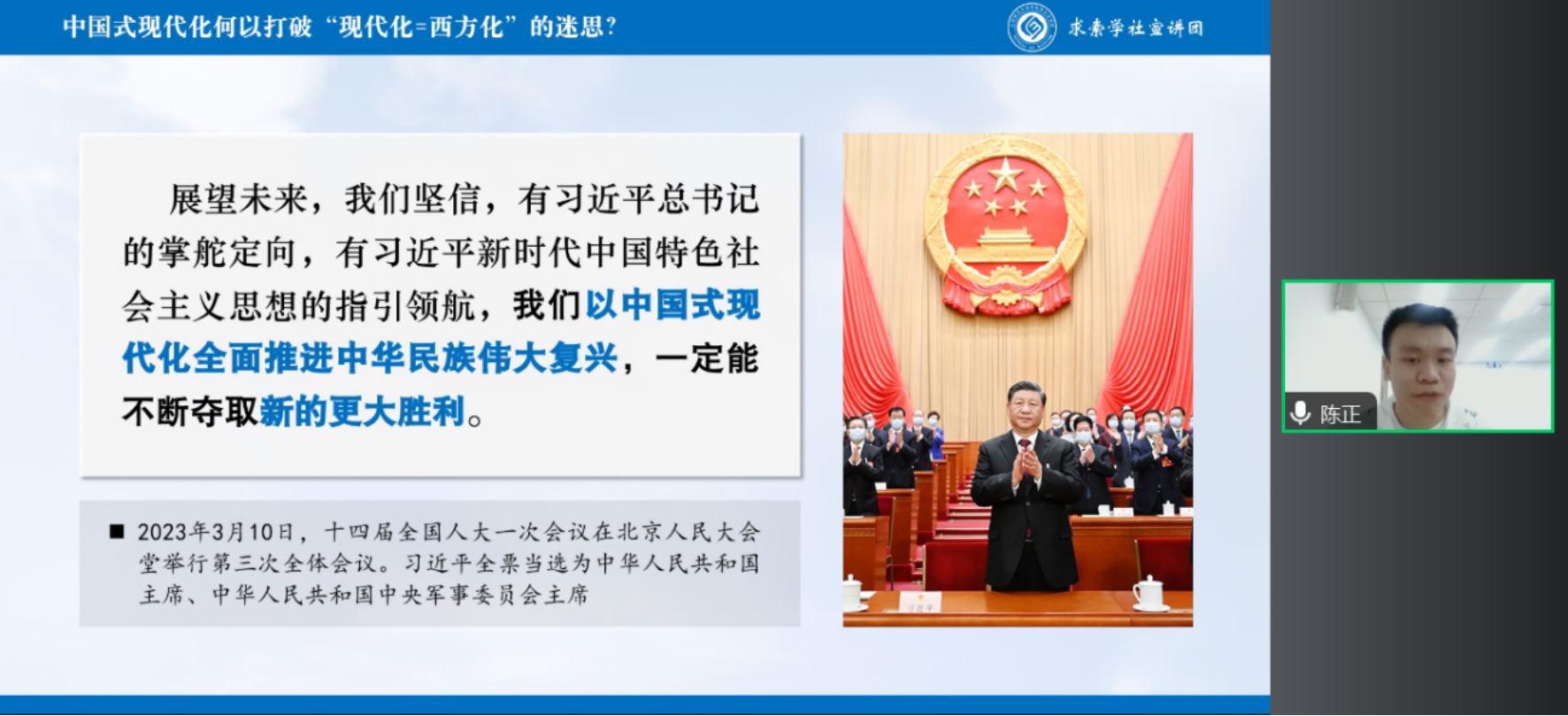 本次活动邀请金牌影院 青春讲师团成员陈正和马天宇同学,带来了主题为《东风浩荡万里澄——中国式现代化何以打破“现代化=西方化”的迷思?》和《学习二十大,永远跟党走,奋进新征程——深入学习领会党的二十大报告精神》的两场宣讲。 在活动开始前,同学们首先进行签到和合影。随后,青春讲师团的两位同学带来了精彩的宣讲。