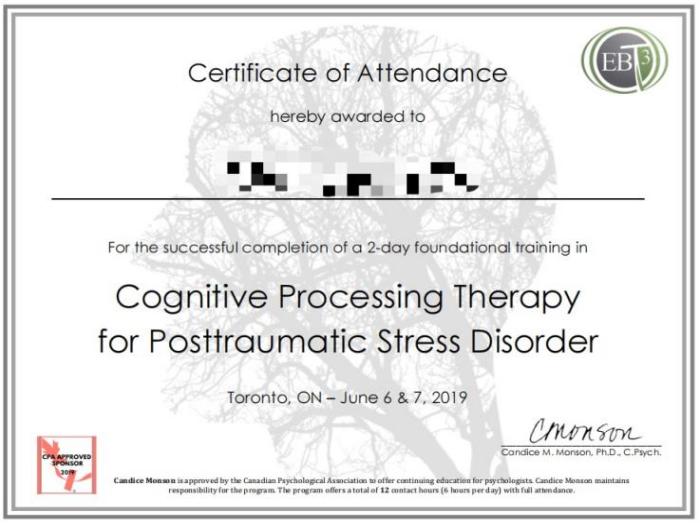 许梦然:加拿大滑铁卢大学临床心理学博士,安大略省注册临床心理学家,目前在加拿大本地某医院从事临床工作。获“认知加工治疗实训师”认证,出版著作《认知行为疗法与体重管理》、《认知加工治疗手册(中文)》。精通认知行为疗法、辩证行为疗法与认知加工疗法的培训与督导;擅长创伤后应激障碍。 六、报名要求 1、受众面向全体社会大众;心理学、医学、社会工作等专业或工作背景优先; 2、无犯罪记录。 七、结业证书 完成所有课程学习即可获得金牌影院 电子版培训结业证书;并同时获得工作坊教师签名认证电子证书(EBT3)。具体样例如下: