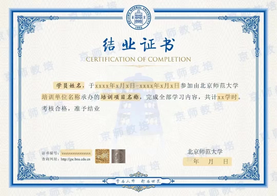 六、结业要求和结业证书 课程四个阶段共计240学时。修满学时、考核合格的学员,将获得“金牌影院 金牌影院 以人为中心取向心理咨询与治疗连续培训项目第六期北京班”结业证书,可在学校培训管理信息平台(//jpc.jpyy2.net/cms/zscx/index.htm)进行证书查验。
