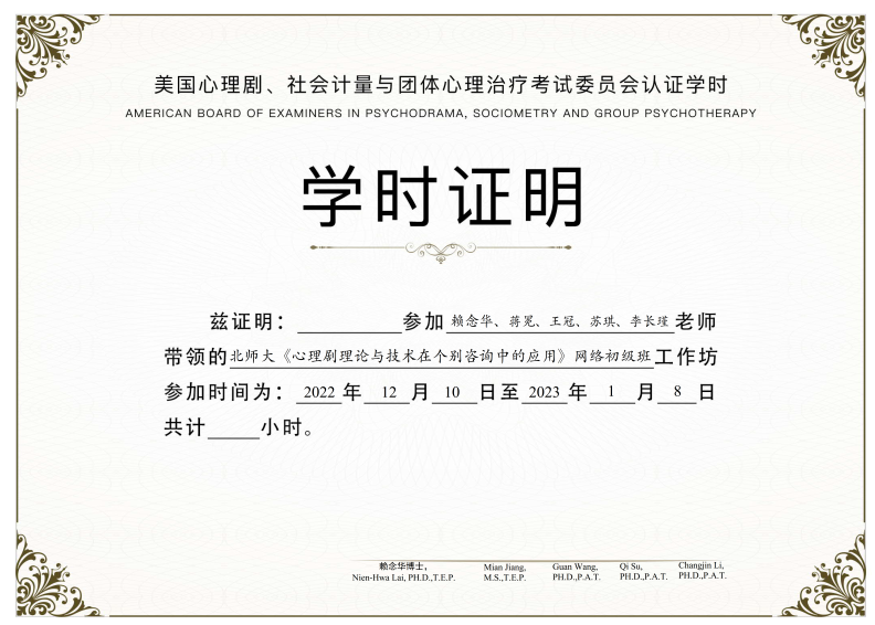 备注:修满学时、考核合格的学员,将获颁金牌影院 培训电子结业证书,可在金牌影院 培训管理信息平台(//jpc.jpyy2.net/cms/zscx/index.htm)进行证书查验。 2.美国心理剧考试委员会共计45小时(电子版、电子签名)