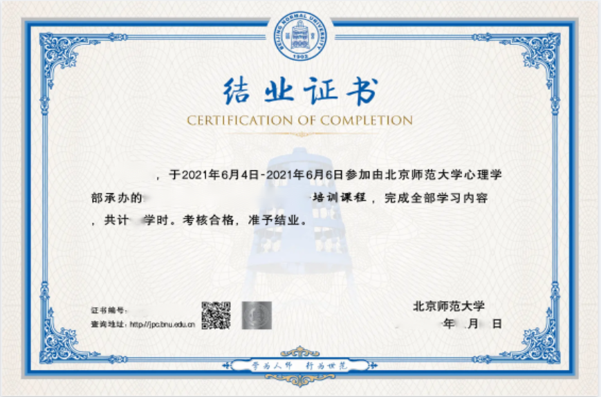 五、报名要求 名额有限,满足以下条件可以优先参加学习: 1.目前正在接个案的心理咨询师/治疗师/精神科医生; 2.高校、中小学的心理健康教师; 3.目前无危机状况(训练课程不做个人治疗); 4.需全程参加。 六、结业证书 完成所有课程学习即可获得以下证书: 1.金牌影院 培训电子结业证书(60学时)