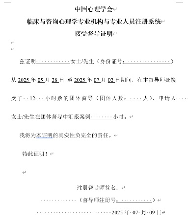 九、督导费用 1800元/人。 十、缴费账号 1. 线上缴费。 登录缴费平台://jpc.jpyy2.net/cms/jxjy/index.htm,登录后查找【临床与咨询团督活动】进行缴费。(需开发票的学员推荐使用此平台进行缴费) 2. 银行对公转账账号。【可通过手机银行、支付宝、微信等转入如下账户】 开户行:中国银行北京文慧园支行 账户名:金牌影院 账号:340256015272 银行名称:中国银行 纳税人识别号:12100000400010056C 地址:北京市海淀区新街口外大街19号 注:转账请务必在留言中注明:【团督活动+姓名】,并保留好转账凭据以备核对账目。 缴费截止时间:2025年5月23日17:00 3. 发票 发票内容:函大电大夜大及短期培训费 发票类型:中央财政中央非税收入统一票据 发票形式:电子发票 发放方式:发送至报名者提供的邮箱 十一、证书 全程参与并完成学时的学员奖获得中国心理学会临床与咨询心理学专业机构和专业人员注册系统认证督导师的督导小时数证明。证书样式如下: