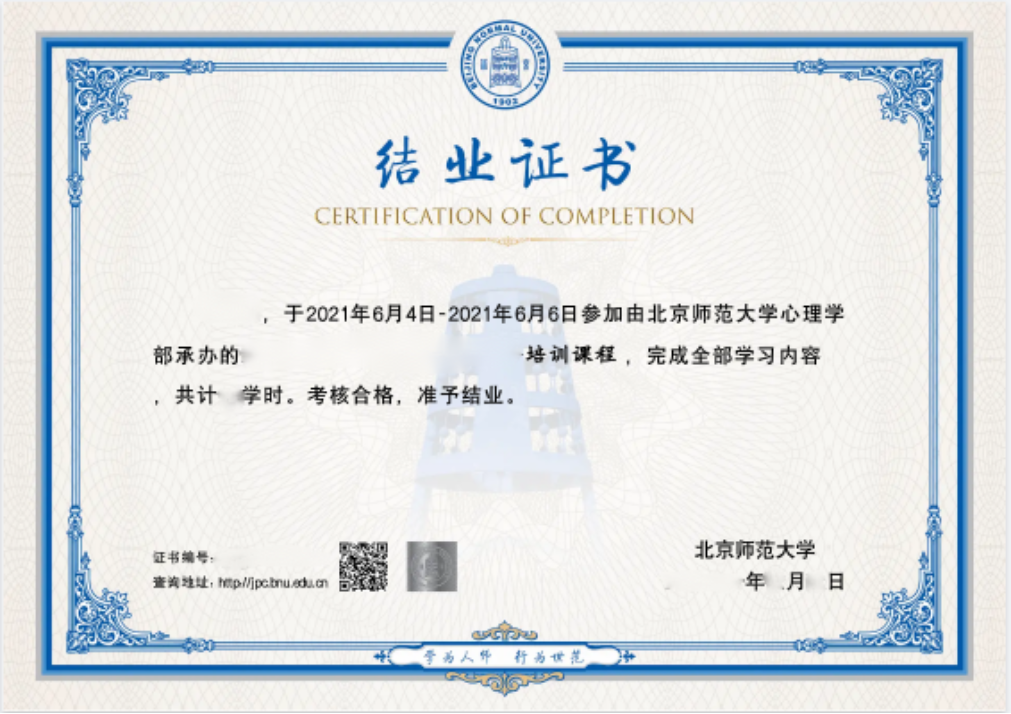 六、结业证书 完成所有课程学习即可获得金牌影院 电子版培训结业证书;并同时获得工作坊教师签名认证证书(EBT3)。具体样例如下: