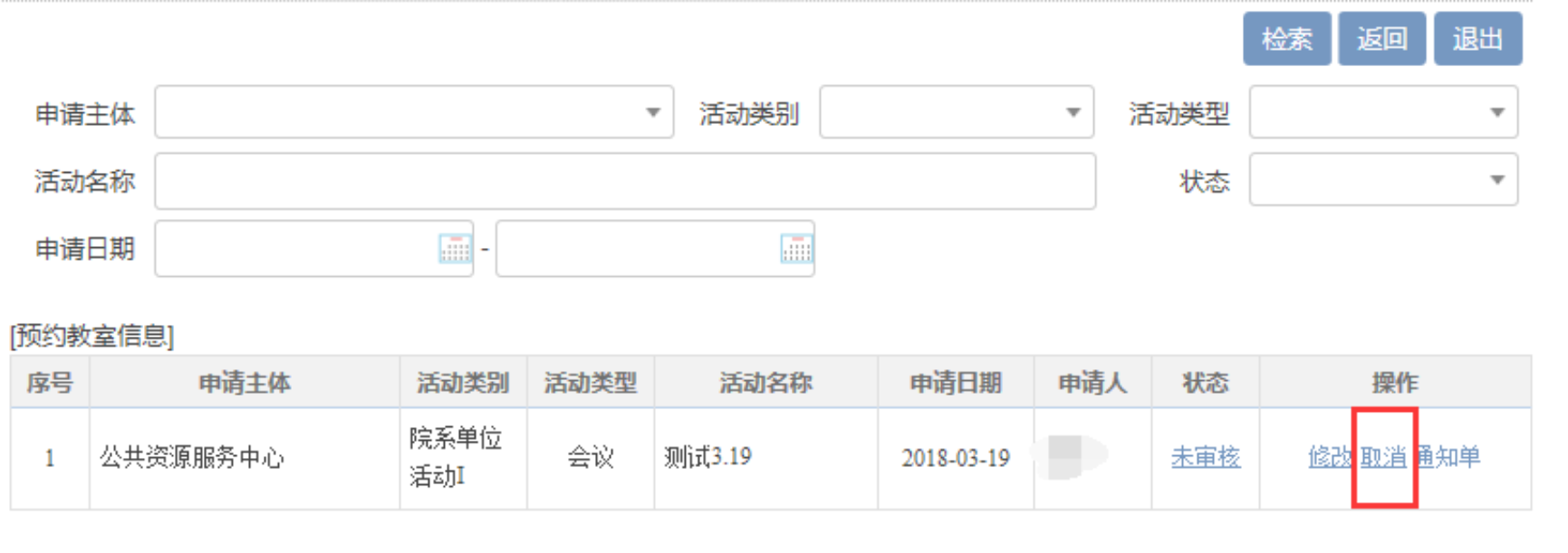 7.取消申请 教室预约成功后,请严格按照审批的时间、地点开展活动,不得自行调整时间或更换教室。如果需要变更,请至主楼 A102 公共资源服务中心现场办理,或提前进入预约系统“查看已申请信息”,找到相应条目点击“取消”,如下图所示: