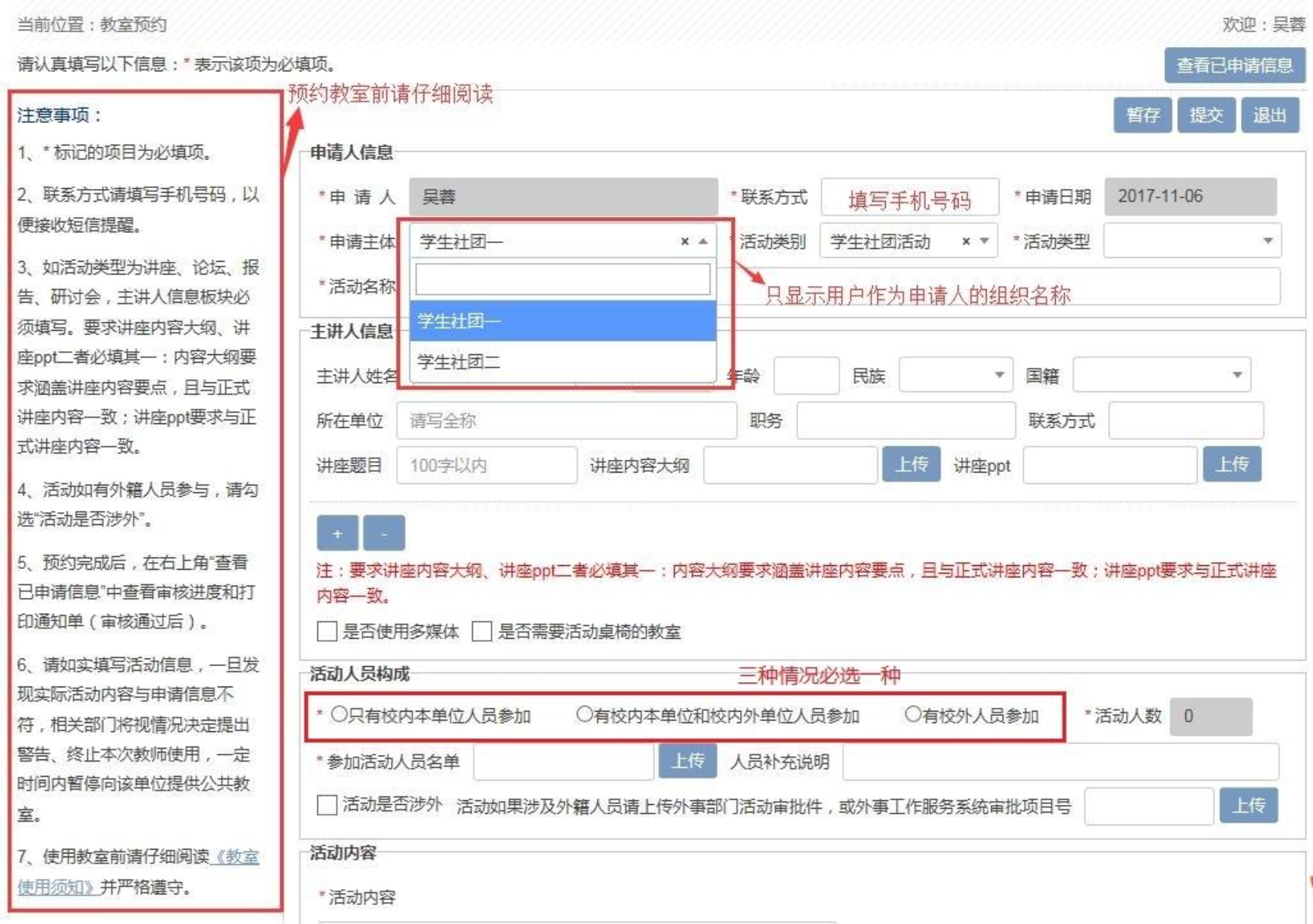 各学生组织、各班级、党团支部: 为充分利用学校资源,学校为各学生组织提供了申请使用学校公共教室资源的渠道,以便于日常开展各类讲座、培训、学生活动等。具体操作流程详见下。 一、系统入口 1.线上系统名称为“教务管理系统-预约教室”。 2.系统入口为 “数字京师” → 左侧栏“全部应用”搜索“教务管理系统” → “个人事务”中“预约教室”服务。 特殊说明:各学生组织和班级仅有主负责人有预约权限,如学部团委副书记、学生会研究生会执行主席、各班级班长、各学生党支部党支书;其他同学无预约权限。 二、预约步骤: 1.阅读左侧注意事项。 2.按要求填写必填项内容,特别注意: (1) 联系方式请填写手机号码,以便接收短信提醒。 (2) 活动人员构成部分,三种人员构成类型必选一项,选择后填写活动人数,人数与可申请教室关联,请如实填写。