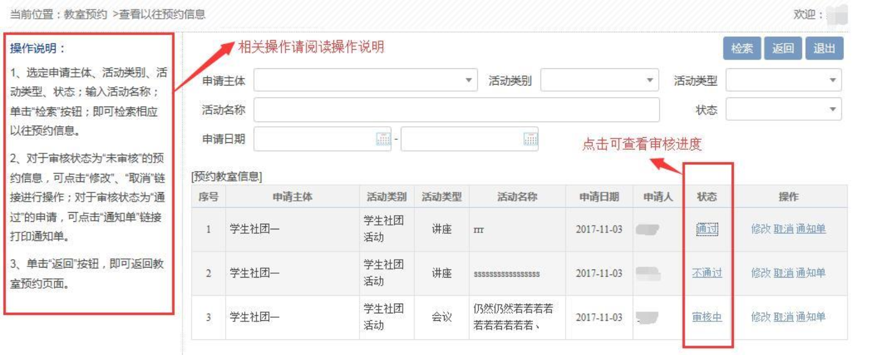 注意:在审核完成(状态为“通过”时),请及时打印通知单,并至少于活动开始前一天送到对应教学楼楼管。